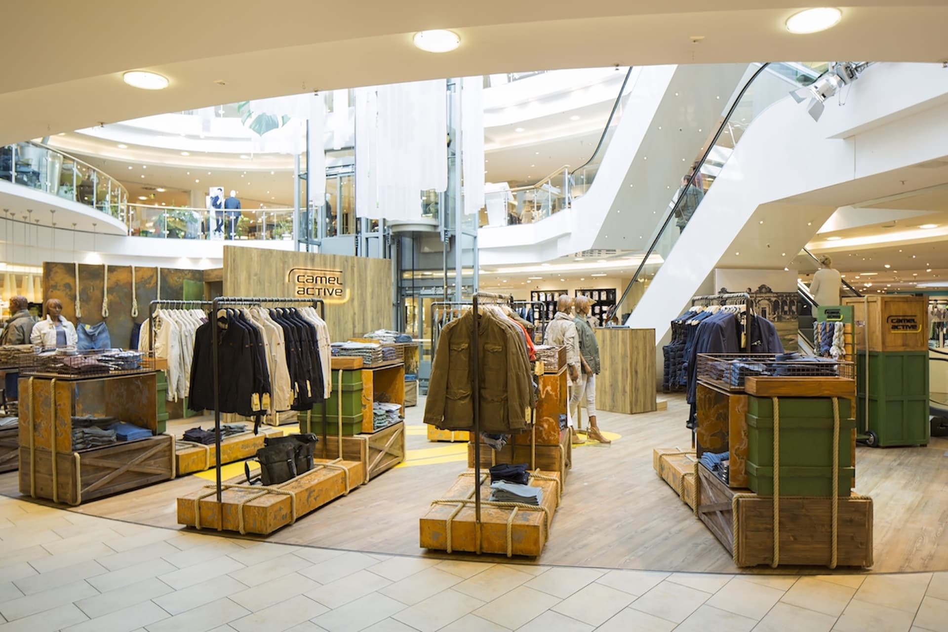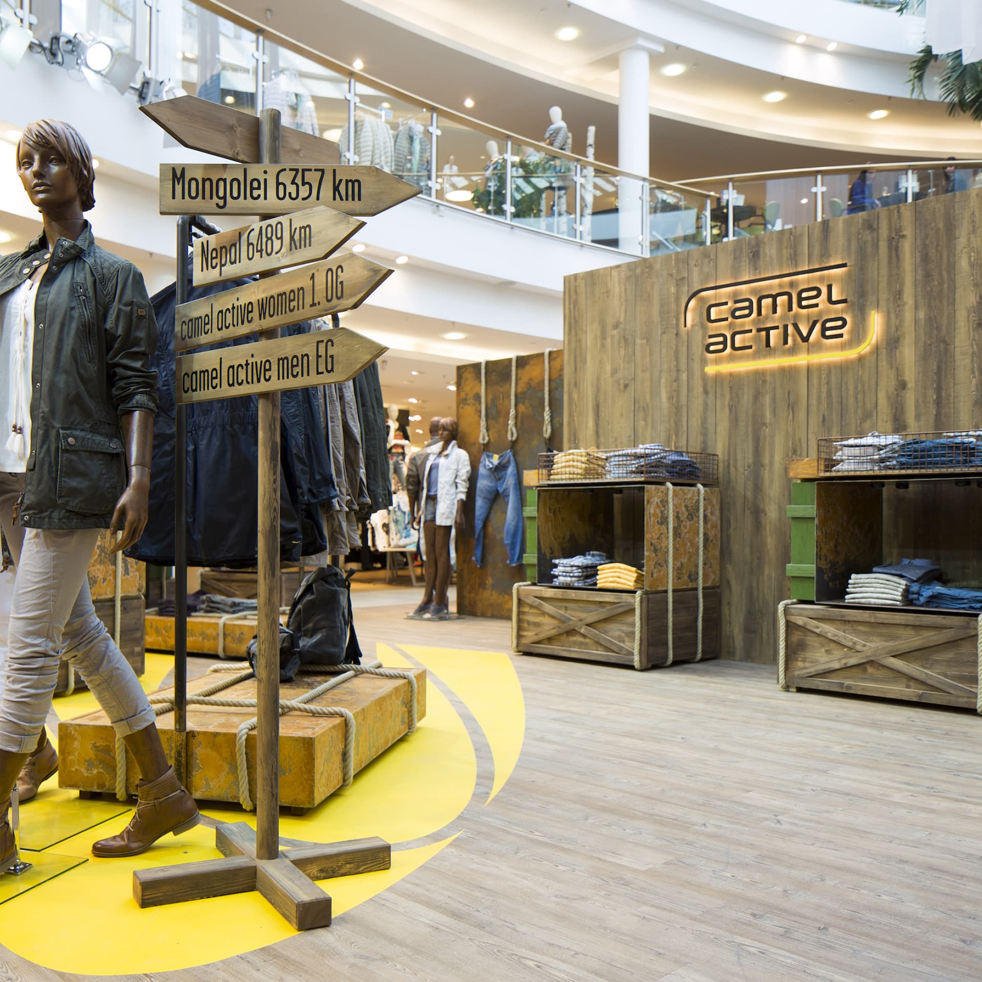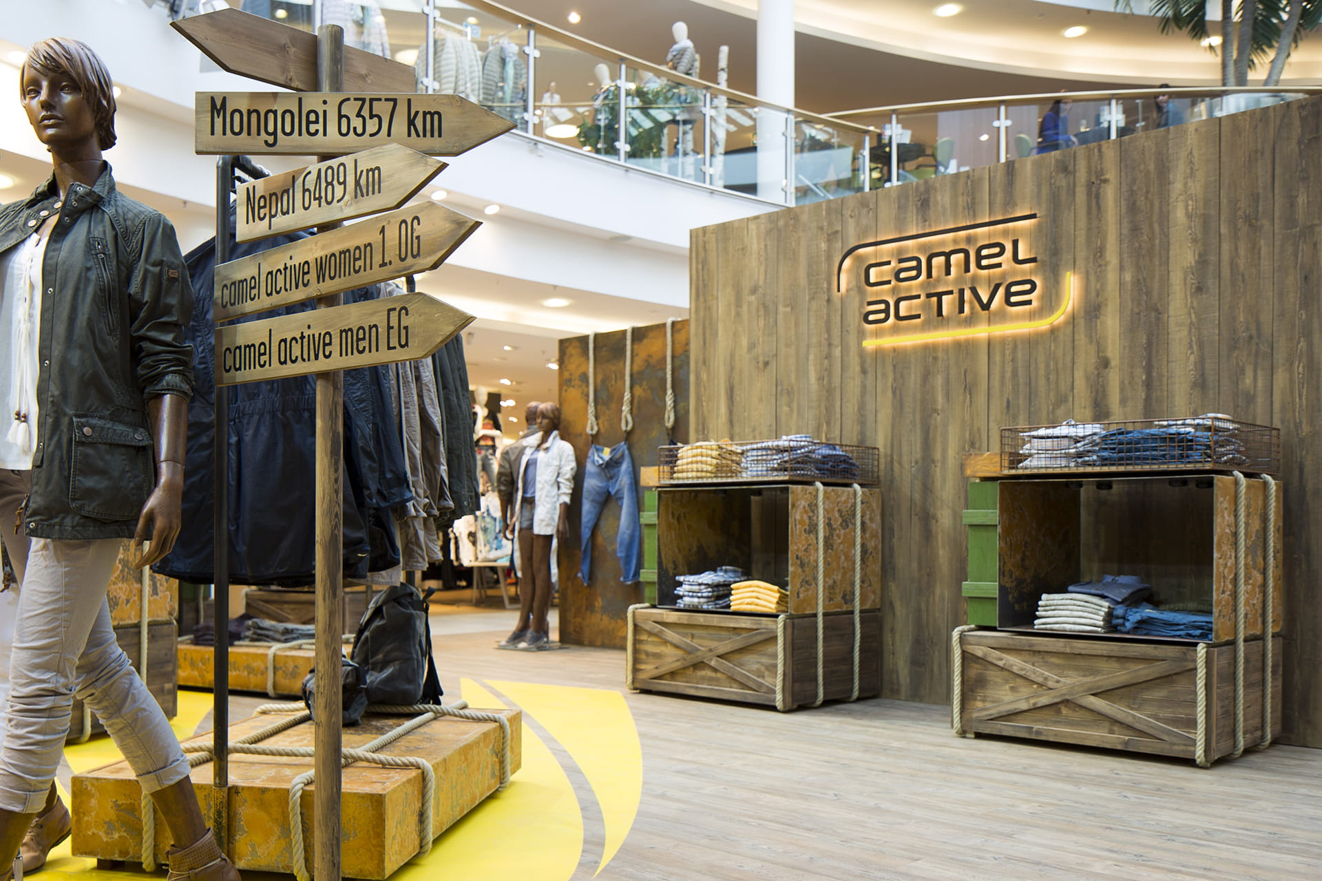 Die Lösung: Möbel, die für Mobilität stehen und die auf ihren zahlreichen Reisen und Abenteuern jede Menge Patina und Charakter gewonnen haben: lackierte Metallkörbe mit Flugrost, hölzerne Transportkisten mit kryptischen Beschriftungen, metallene Flight-Cases mit Macken und Kanten, Vintage-Koffer. Alles verschnürt, vertäut und mit Karabinern gesichert. So brachten wir die Abenteuerlust, das Fernweh und das Flair des Reisens direkt in die Stores und übertrugen dieses Image unmittelbar auf die Fashion von camel active, die in, auf und an diesen Möbeln präsentiert wird.