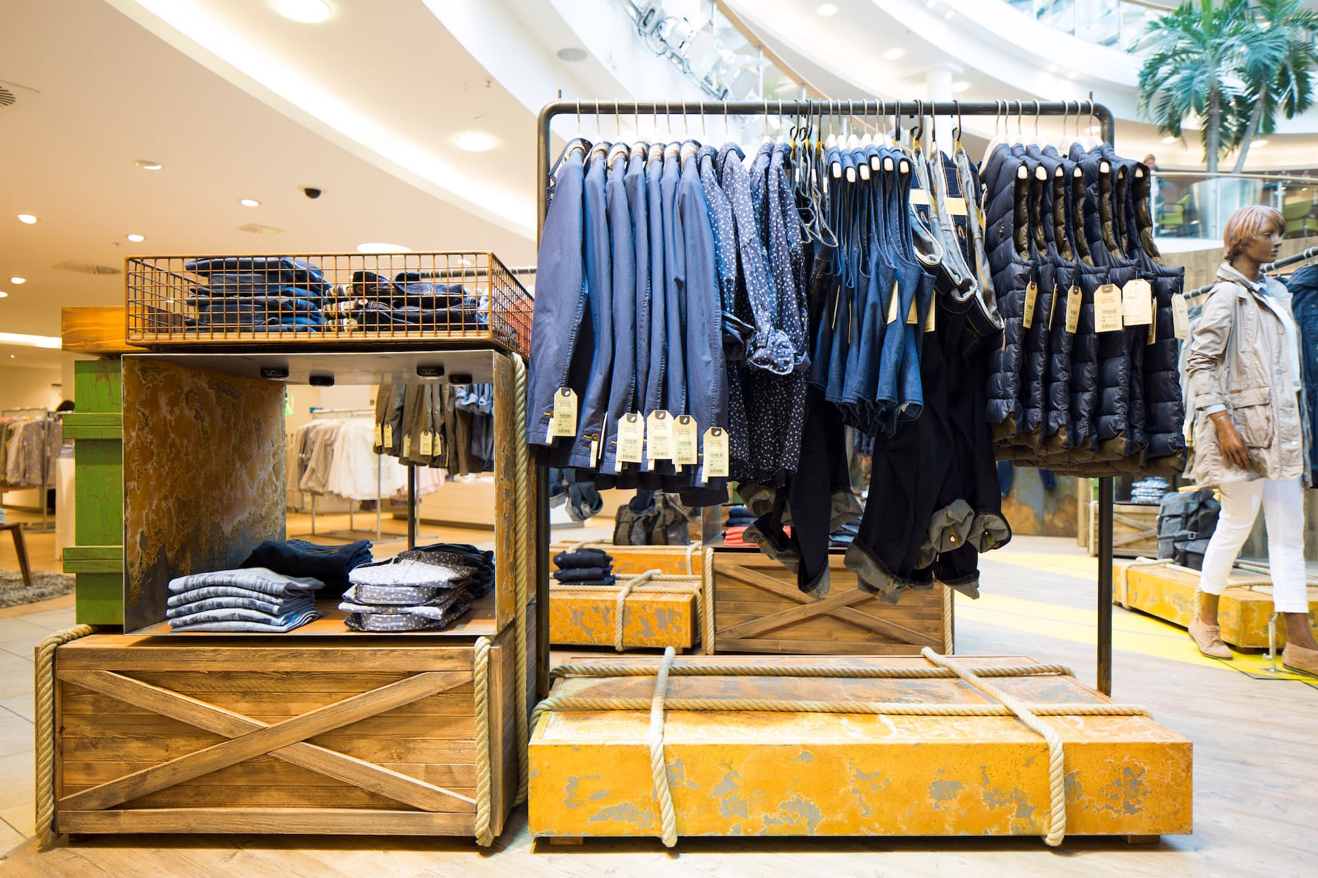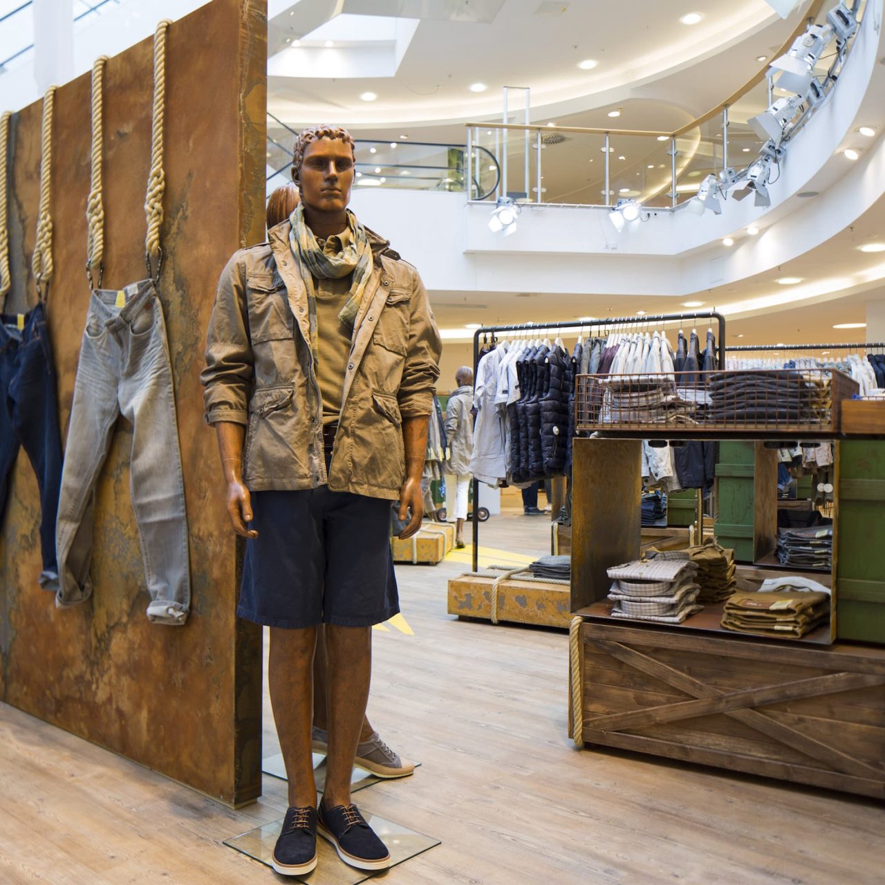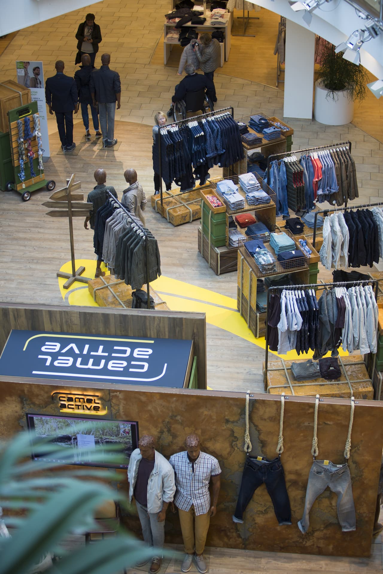 Die Lösung: Möbel, die für Mobilität stehen und die auf ihren zahlreichen Reisen und Abenteuern jede Menge Patina und Charakter gewonnen haben: lackierte Metallkörbe mit Flugrost, hölzerne Transportkisten mit kryptischen Beschriftungen, metallene Flight-Cases mit Macken und Kanten, Vintage-Koffer. Alles verschnürt, vertäut und mit Karabinern gesichert. So brachten wir die Abenteuerlust, das Fernweh und das Flair des Reisens direkt in die Stores und übertrugen dieses Image unmittelbar auf die Fashion von camel active, die in, auf und an diesen Möbeln präsentiert wird.