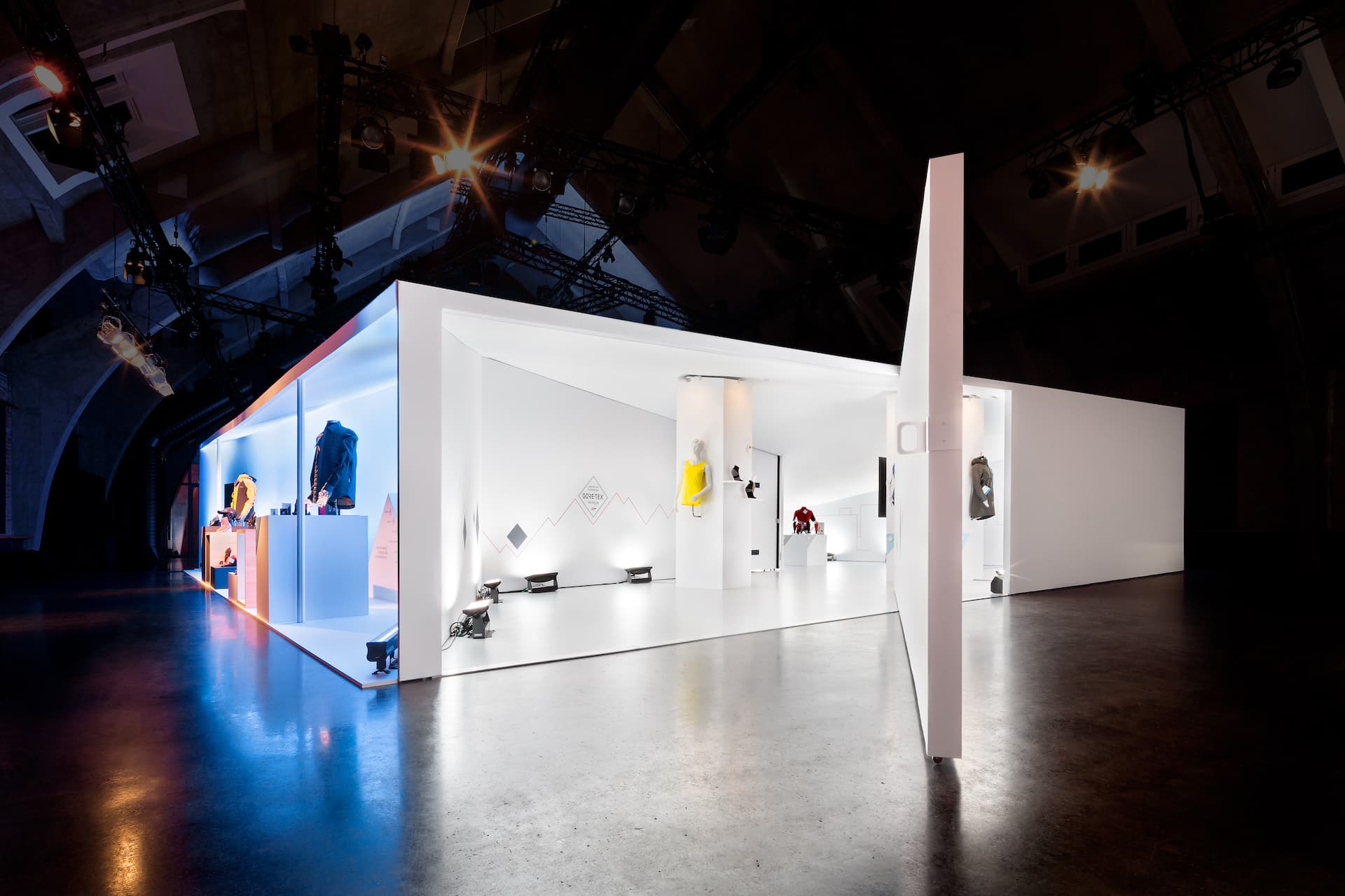 Zu diesem Zweck entwickelten wir einen dreidimensionalen Markendiamanten, der im Inneren die Black Label-Produkte von GORE-TEX präsentierte. Hier starteten die Besucher ihren Rundgang und bekamen so die Botschaft vermittelt: GORE-TEX bleibt sich und seinem Markenkern treu. Durch eine Tür gelangten die Besucher anschließend in den weiß gestalteten White Label-Bereich. Auf diese Weise erlebten sie die neuen Produkte als natürliche Evolution des bestehenden Portfolios. Ein Konzept, dass aufging: Viele Händler nutzten die Gelegenheit, um gleich an Ort und Stelle in die Vertragsverhandlungen einzusteigen.
